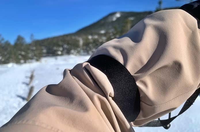 履き口部分のカフスは長く、前腕をすっぽりと覆うことができます。しかも伸縮性のある二重織素材なので、手首の動かしやすさはしっかりキープ。入口部分のゴムバンドは片手で調整可能で雪の侵入をしっかりと防いでくれます。