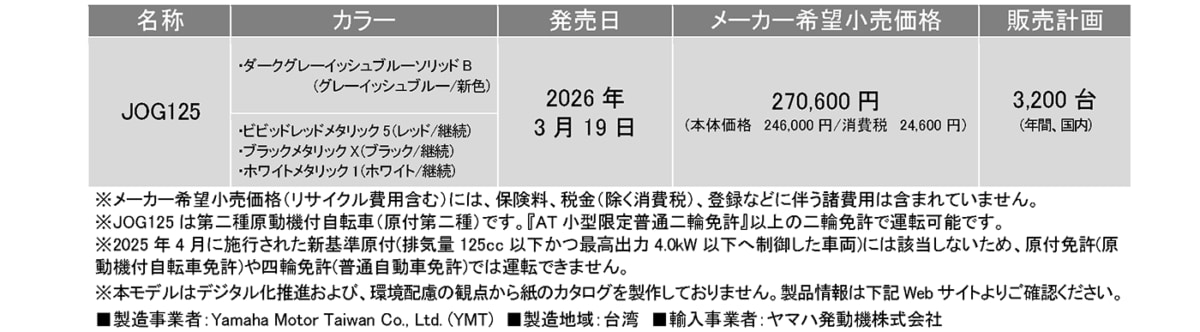 ヤマハ発動機販売株式会社は、原付二種のスタンダードモデル「JOG125」の新色を3月19日に発売します。