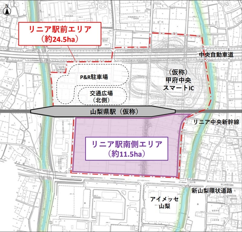 この駅の最大の特徴は、中央自動車道に新設される「(仮称)甲府中央スマートIC」と直結すること。新幹線やリニアの駅が都市間高速道路のインターチェンジとダイレクトに結ばれるのは日本初となります。