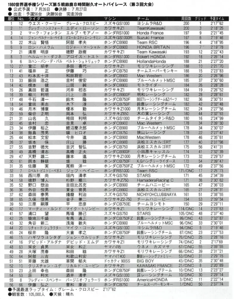 それまではエキジビション的なレースだった鈴鹿8耐が、世界耐久選手権に組み込まれたのはこの年から。と言うより、1979年までは欧州選手権だった耐久シリーズ戦が、FIMが認定する世界選手権になったのもこの年からである。そして、4サイクル:600〜1000cc、2サイクル:350〜500ccという、世界共通のTT-F1レギュレーションが施行された1980年の鈴鹿には、78/79年の倍以上となる14もの外国人コンビが参戦することとなった。