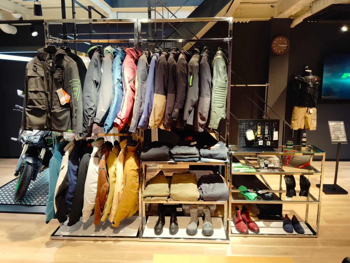 木目調のフロアと白い天井が織りなす明るい店内。モーターサイクルとプラザアパレルがゆったりと展示され、どなたでも楽しめる空間となっています。
