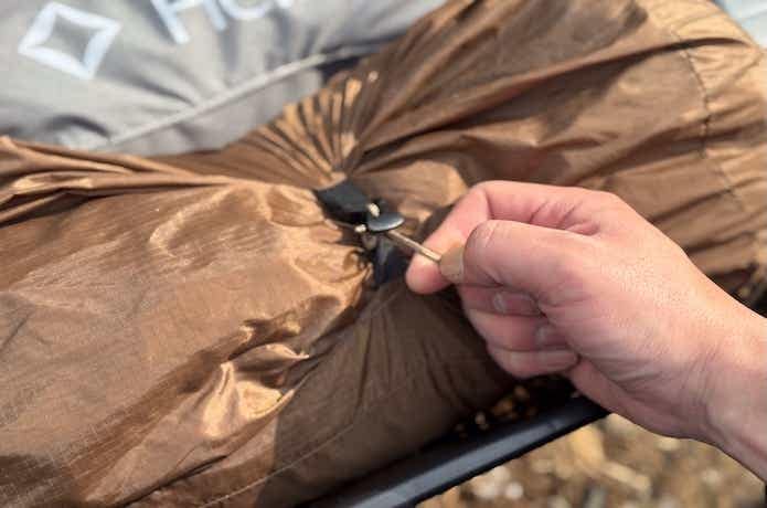 スリーブに通し終えたら、ポールの終端を固定パーツへ差し込むだけ。先端側はクローズドスリーブなので、1人で設営していてもすっぽ抜けることがなく、ノンストレスです。
