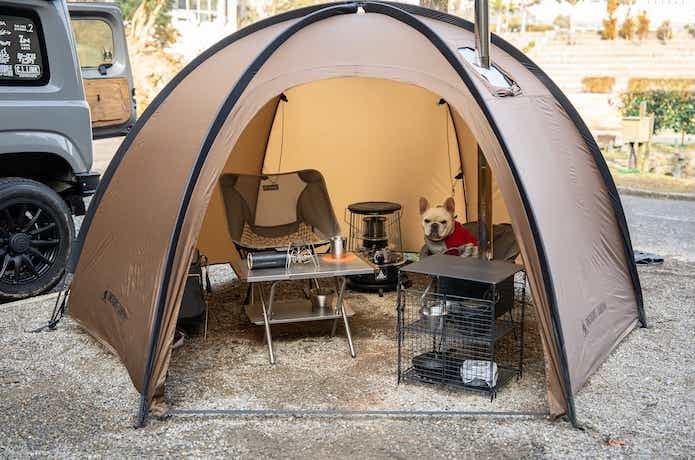テーブルやラック、薪ストーブを置いても余裕があり、愛犬が過ごすスペースもちゃんと確保でき、筆者+愛犬にとって、冬キャンプのリビングスペースとして最適なサイズ感。