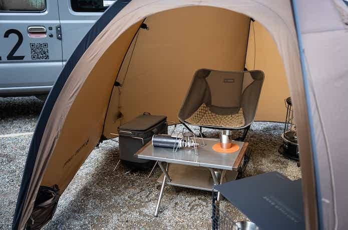 設営時のサイズは長さ260×幅260×高さ135cmで、外からだと一見狭そうですが、中に入ってみるとヘリノックス「チェアワン」に座っても広々しています。