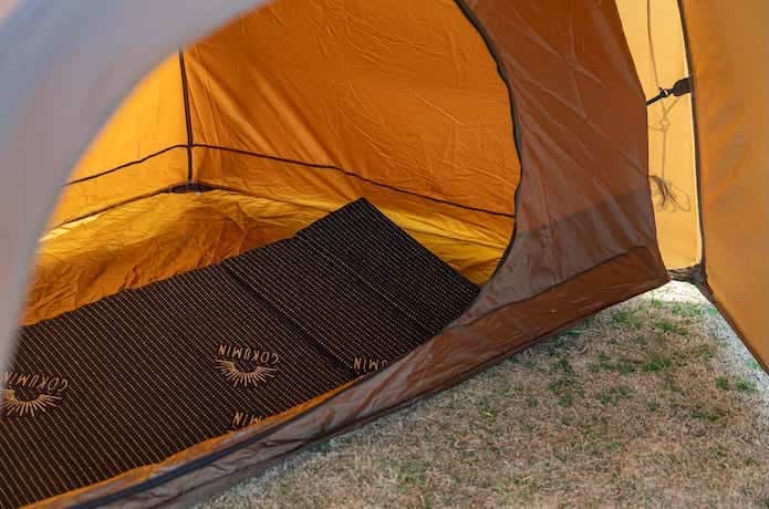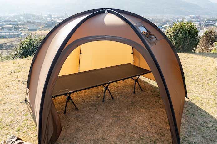 ただし、インナーテント内のスペースは、奥に向かって狭くなる台形フォルム。コットだとかなり窮屈になるため、マットの使用がおすすめです。