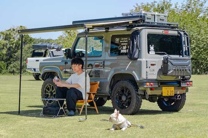 とにかく手軽で簡単にキャンプを楽しむため、愛車のジムニーでの、カーサイドタープ&車中泊スタイルが多い筆者。