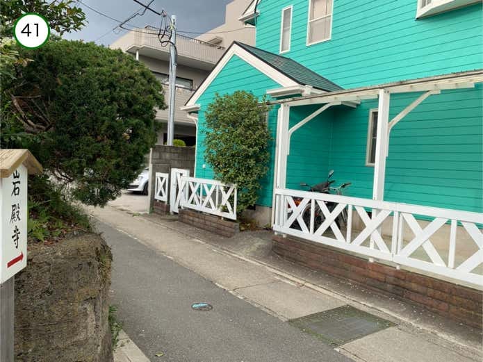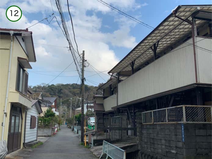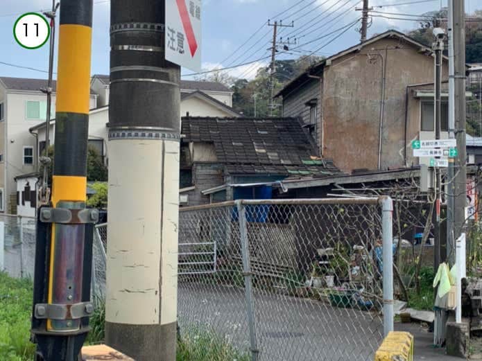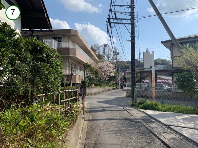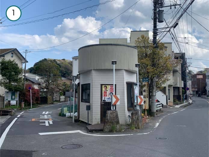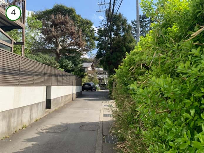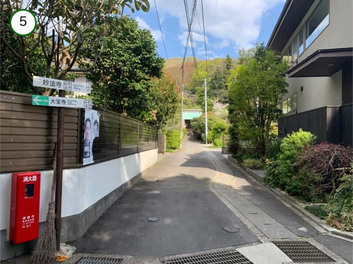 名越バス停(写真右奥)から県道311号鎌倉葉山線沿いに40mほど戻り、この二叉路を左の路地へと進みます。