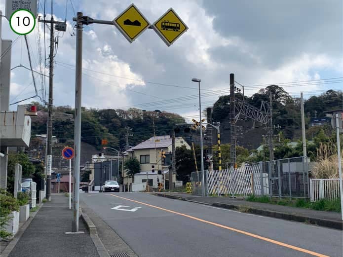山門をくぐると、踏切は渡らずにJR横須賀線の脇を走る県道205号金沢逗子線に沿って歩きます。交通量が多いので歩道がある左側を通行してください。