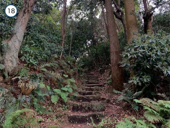 無縁諸霊之碑周辺だけは森が開けて広場のようになっていますが、写真奥の階段を登ると、再び森の中のハイキングコースとなります。