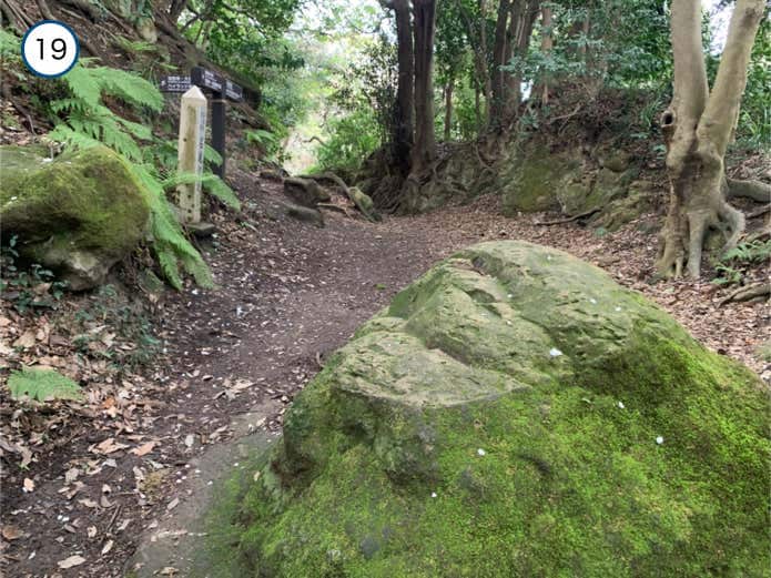 登りきって苔むした巨岩のある場所が「名越切通し分岐」。鎌倉市と逗子市の境界でもあります。