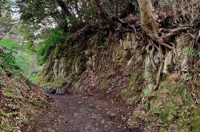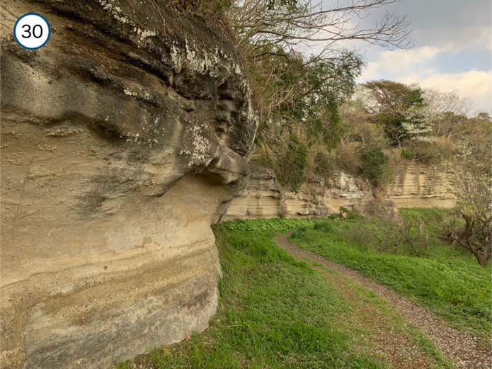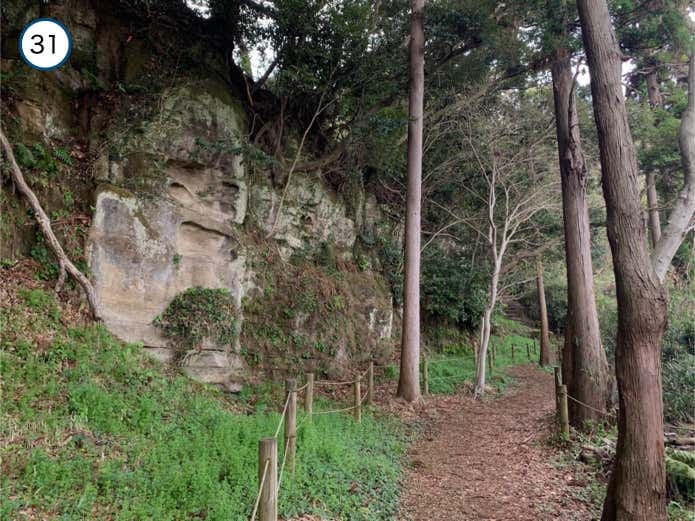 険しい地形のため「難越(なごし)」とも呼ばれたこのコースでは、切通しだけでなく山の斜面を削って断崖絶壁にした切岸(きりぎし)を見ることもできます。軍事的な要衝だけでなく石材の産地でもあったという歴史の面影をたどりながら、今回は鎌倉市を抜けて逗子市へと歩いてみます。