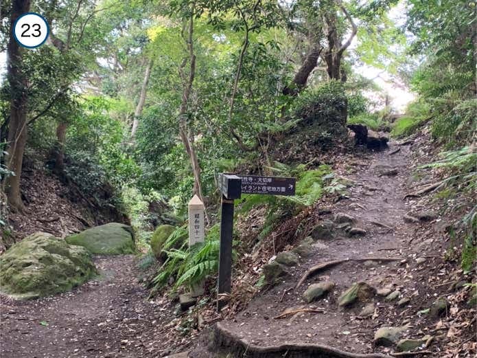 名越切通しから引き返して、[19]と同じ名越切通し分岐へと戻ってきました。「法性寺・大切岸」の道標に従って、右手へ進みます。
