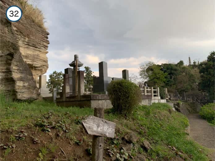 分岐に戻り右手を下っていくと、切岸の下に墓地がある名越切通し・法性寺口に出ます。ここからは墓地の中の舗装路を進みます。