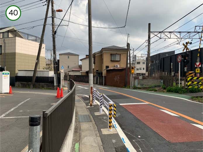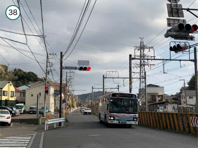 交番のある場所で県道と合流したら、奥に見えるJR横須賀線の踏切を渡ります。