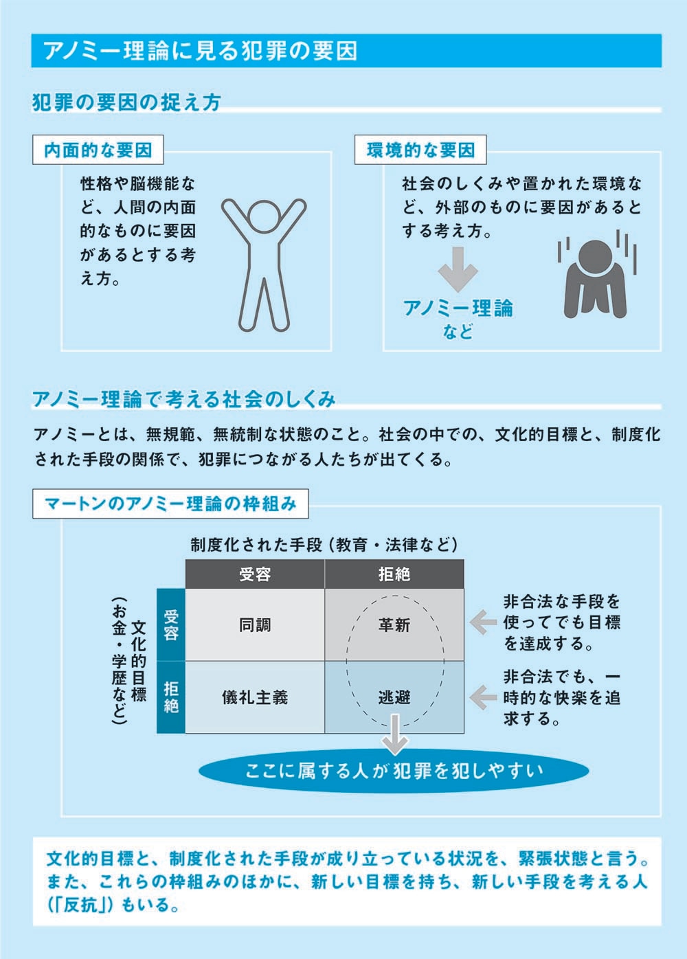 マートンは、このような状態を文化的目標と制度化された手段の緊張状態として捉えました。