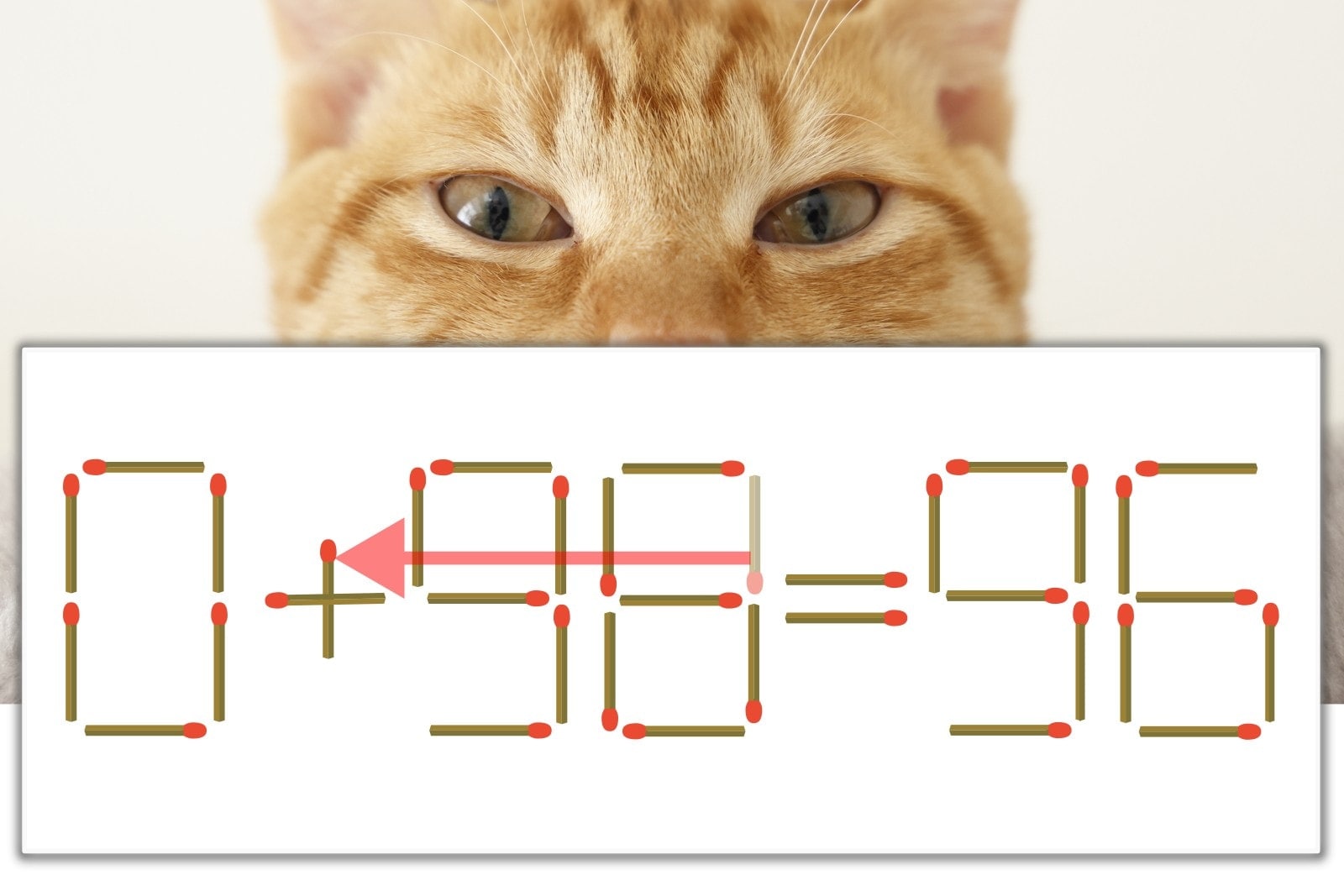 「8」を別の数字に変化させると答えが導き出せます。「8」のマッチ棒を1本移動して、「-」を「+」にしてみましょう。すると、「0+96=96」が成立します。