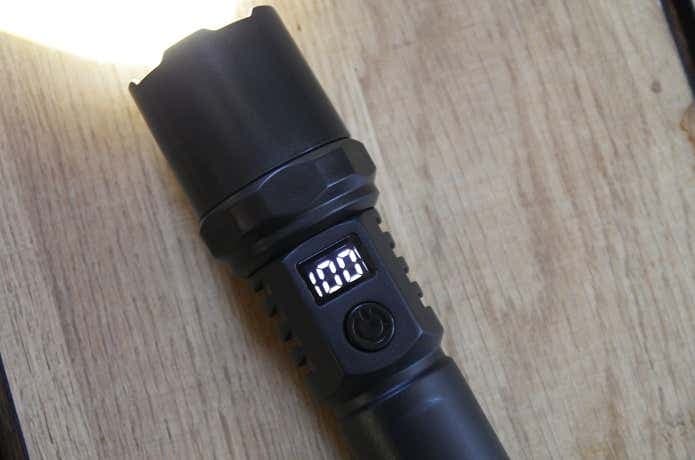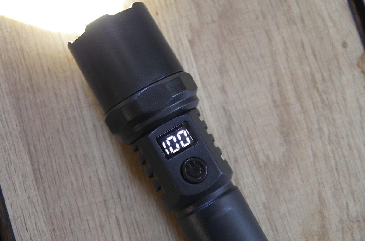 すでにここまでの画像で気が付いている方もいらっしゃると思いますが、このLEDライト、ヘッド下、主電源の上にデジタル表示でバッテリー残量が確認できるようになっています。