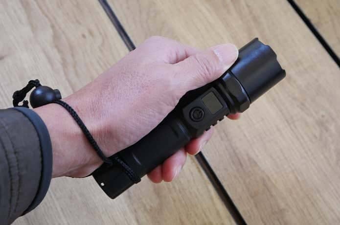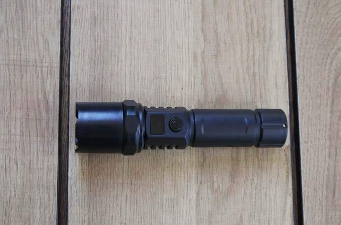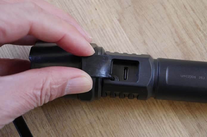通常ハンディライトにはハンドストラップが装備されていますが、このLEDライトにはストラップを通す穴のみが装備されていて、ストラップはありません。でも、自分好みのストラップを装着した方がいいですし、開けられた穴に通さなくてもテール部に備わる溝に沿って細引きを巻いて固定できるので、よりアウトドアらしさを演出できます。