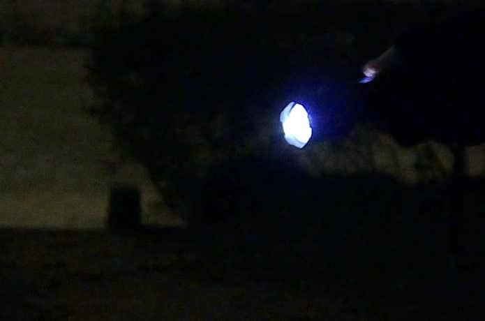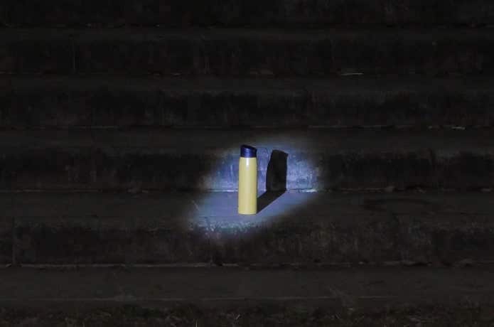 上画像は、約50m離れた場所からスポット光でサーモボトルを照らした様子です。十分な強さで、遠くまでを照らしてくれています。これなら、山で案内標識等を遠くからも確認できるでしょう。