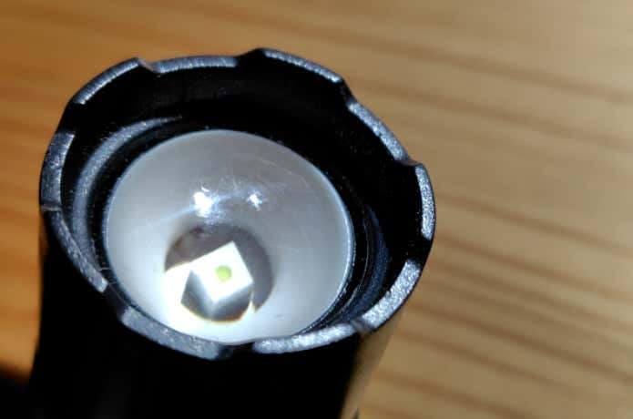 ワイド光での美しい光を実現しているのは、このLEDライトがレンズを装備しているからだと思われます。点灯部を見てみると半円形のレンズが採用されていることがわかります。中央の四角いチップは、LEDチップです。このチップが放った光を、半円形のレンズが丸くムラなく拡散させているのです。