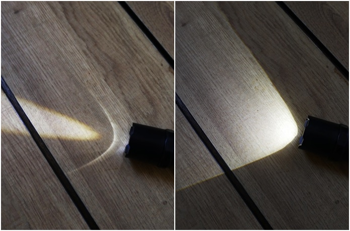 上画像は、右がワイド光、左がスポット光です。これだと、「まぁ、ヘッドをスライドするだけで、光を変更できるなら便利だよね」というレベルです。