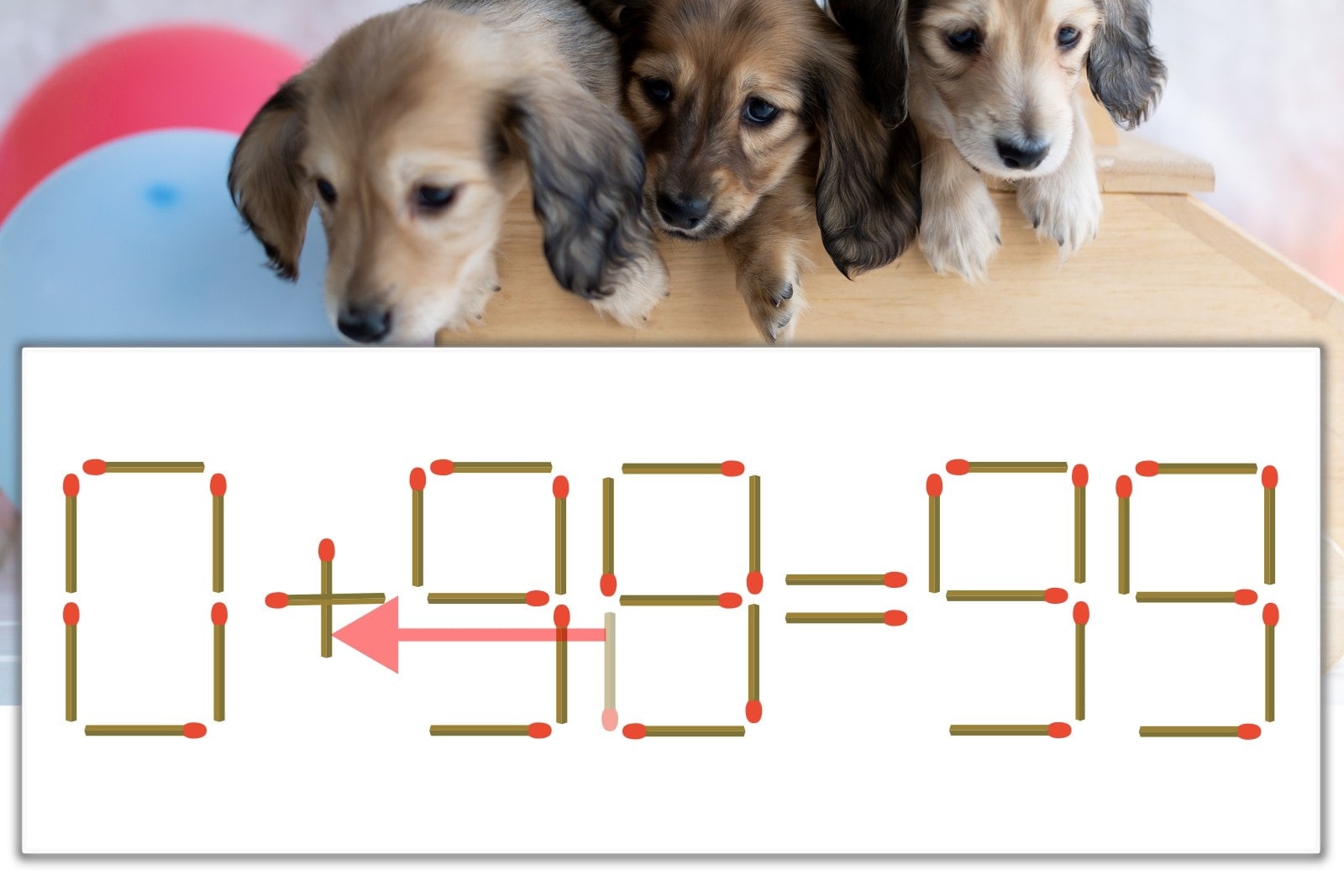 「8」を別の数字に変化させると答えが導き出せます。「8」のマッチ棒を1本移動して、「-」を「+」にしてみましょう。すると、「0+99=99」が成立します。