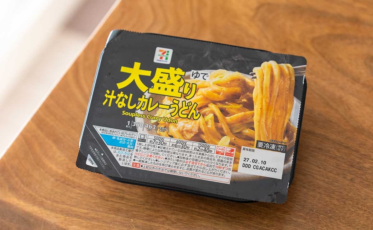 本商品は、セブンプレミアムブランドの冷凍食品で、スパイスとだしが香る大盛りの汁なしカレーうどんです。