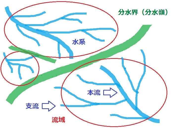 青線が川であり、「分水界」を隔ててそれぞれ流れる「本流」と「支流」を合わせて、その河川の「水系」といいます。その「水系」が流れる全範囲が『流域』で、赤で囲った部分です。そして、となりあった「流域」を分ける境界のことも「分水界」と呼びます。