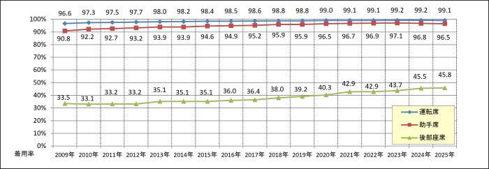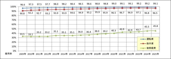 タクシーなどで後部座席に乗るときは、「シートベルトをお願いします」と注意喚起されるものだが、家族や友人と自家用車に乗る場合でも、後部座席の人がシートベルトをしっかり着用しているか気を払っているだろうか? JAF(日本自動車連盟・東京)が2025年10月6日(月)~11月7日(金)に警察庁と合同で「シートベルト着用状況全国調査」を実施したところ、後部座席でのシートベルト着用率は一般道路でなんと半数を割り、45.8%にとどまった。