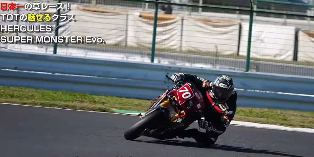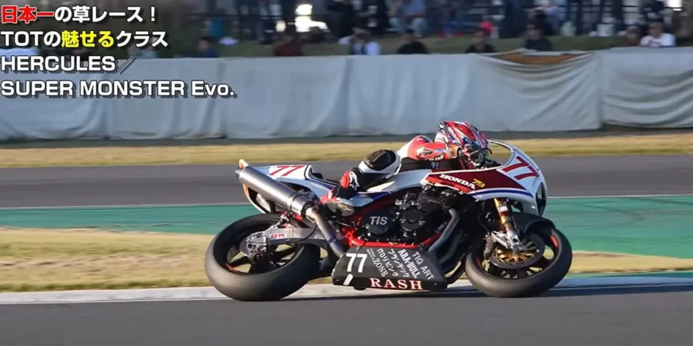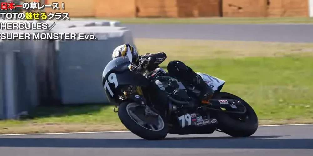 ホンダCB1100Rを操ってハーキュリーと混走のS.M-Evoクラスに参戦しています。旧車ベースながらカーブでもストレートでも繋ぎ目のない加速でスムーズにスライドしています。サンクチュアリーが参加していない今、空冷スーパークーモンエボクラスでは最強と言えるでしょう。ハーキュリークラスの中で何位にランクインするか期待が高まります。