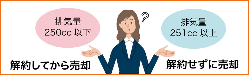バイクを売却する際、排気量が250cc以下のバイクに関しては、自賠責保険を解約してから売却するのが一般的です。251cc以上のバイクであれば、自賠責保険を解約せずに売却するケースが多い傾向にあります。