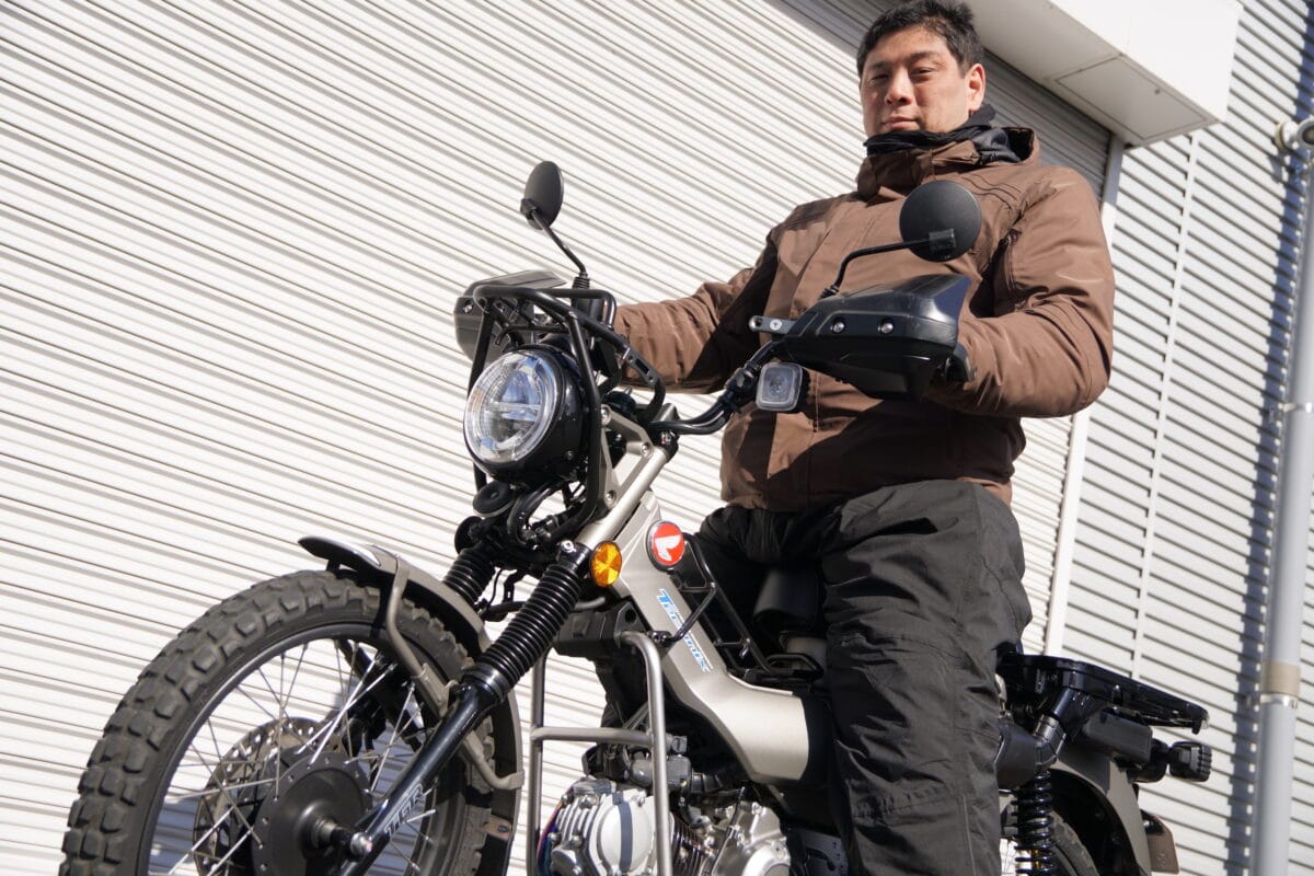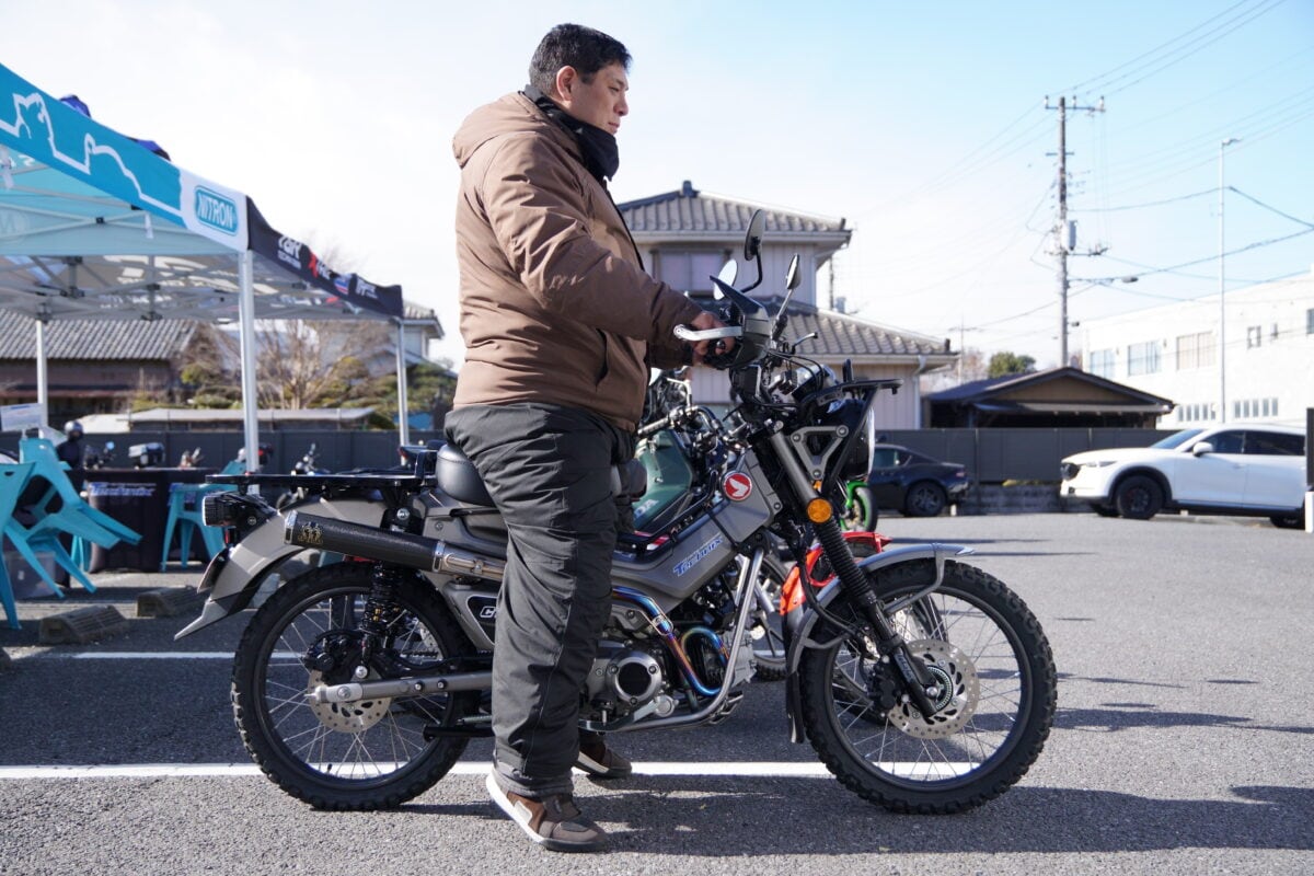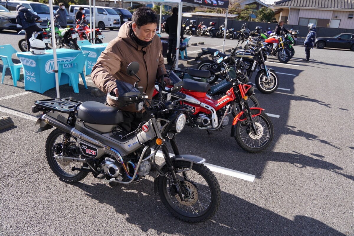 「最近、CT125 ハンターカブで林道遊びをすることが増えたんですが、ノーマルの足回りだとギャップで跳ねてしまうし、段差では突き上げが来ます。気になってたときにこちらの試乗会でハンターカブの林道仕様に乗れると聞いたので来ました」。
