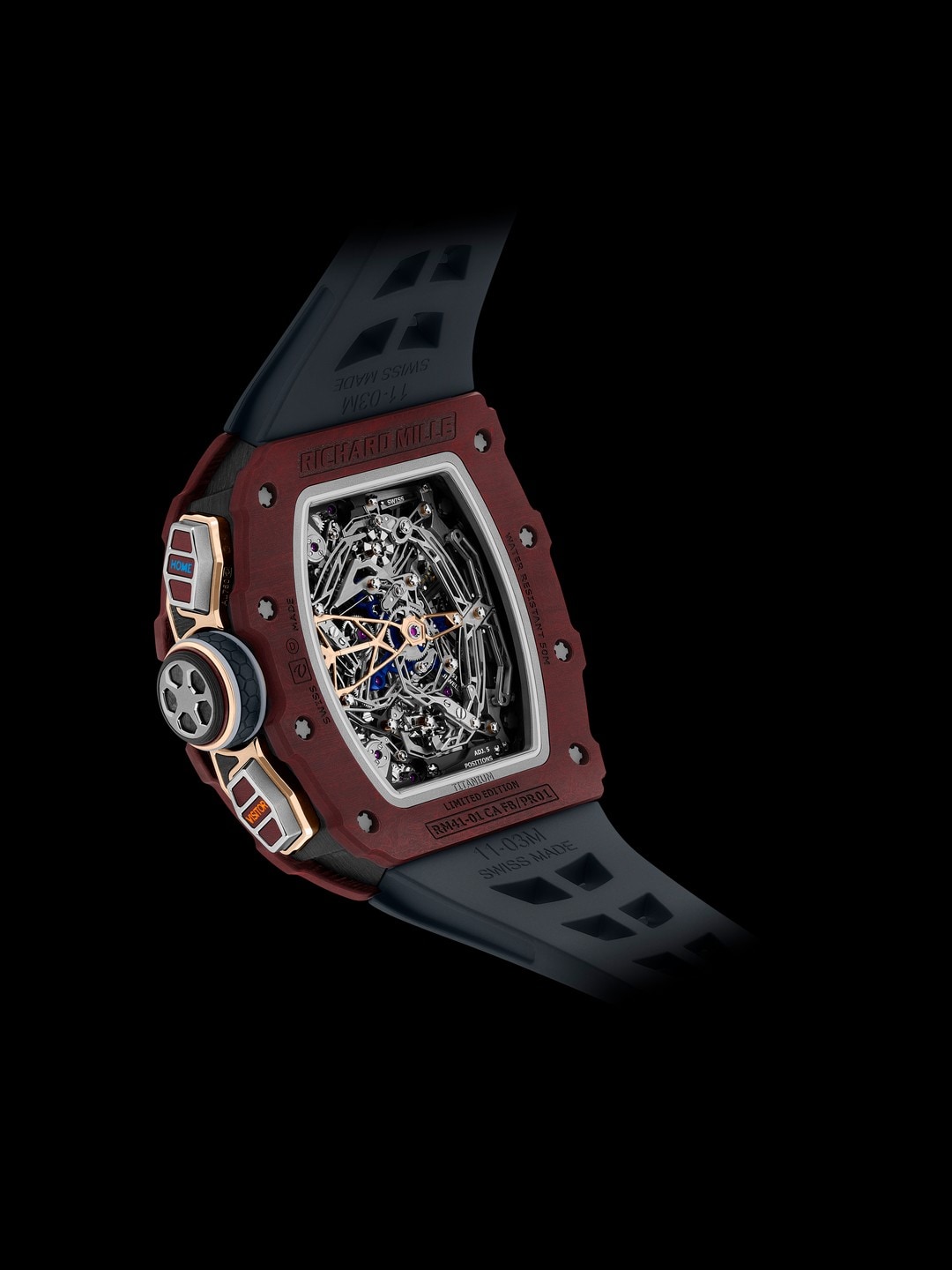 このモデルの心臓部は、オーデマ ピゲ ル・ロックルとの共同開発により5年がかりで生み出された、特許取得済みのトゥールビヨン フライバッククロノグラフ キャリバー「RM41-01」だ。650個もの部品で構成されるこの超複雑ムーブメントは、2つの革新的な機構をその身に宿している。