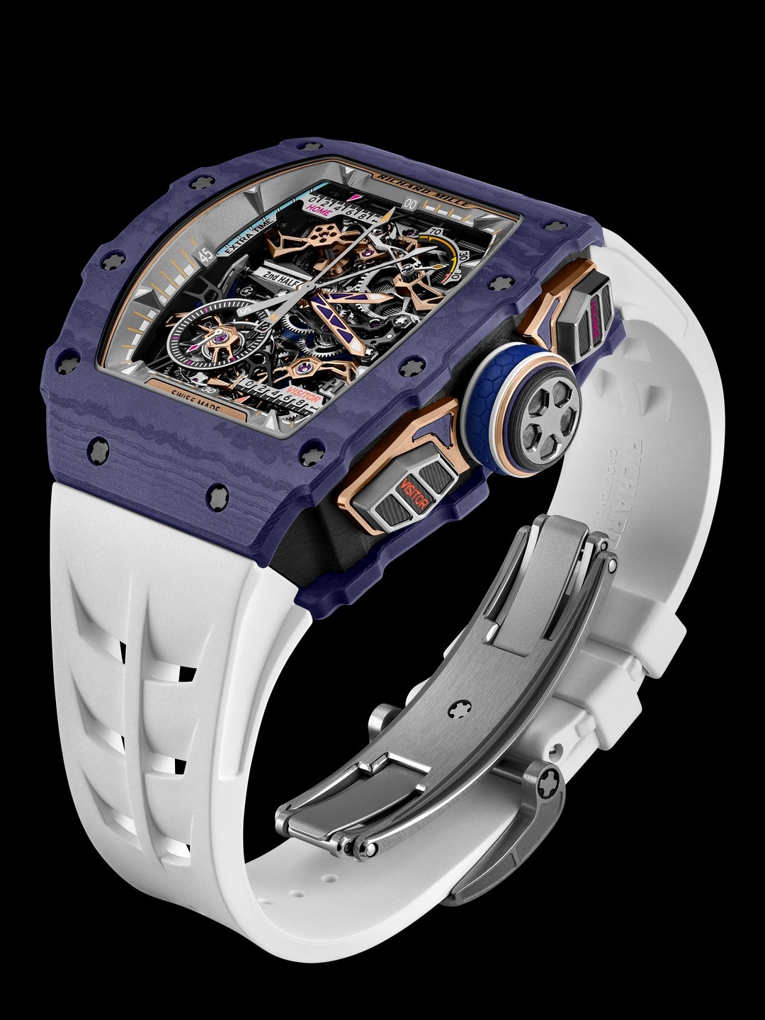 この複雑なエンジンを保護するケースには、最新の複合素材「バサルトTPT®」が採用されている。火山岩である玄武岩の繊維から作られたこの素材は、カーボンTPT®同様、卓越した機械的性能と耐性を誇る。まるでレーシングカーのカーボンモノコックのように、軽量でありながら内部の精密機械をあらゆる衝撃から守り抜くのだ。事実、ケースとストラップを合わせて約800もの部品で構成されるこの時計は、5,000gの衝撃耐性テストを含む、ブランド独自の過酷な試験をクリアしているという。