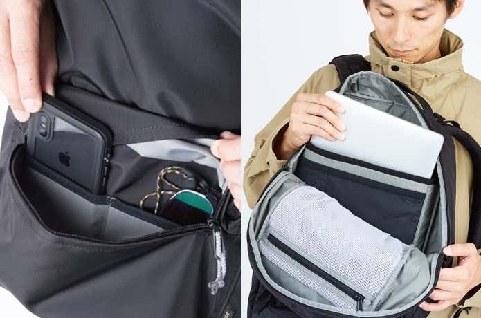 見た目にはスッキリとしたデザインながら、内部は小物の整理がしやすい設計になっているのもポイント。キーフックやペンホルダーなどの小物類から乱雑になりやすいケーブル類までスッキリまとまるので、荷物を出し入れする際のストレスが軽減されます。通学やビジネスには、ノートPC専用スリーブ付きのモデルが便利。