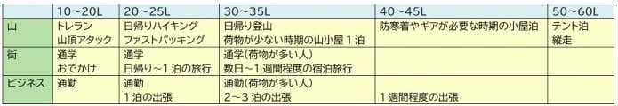 こちらの表を参考に、着用するシーンや荷物の量と照らし合わせながら自分に最適な容量を選びましょう。
