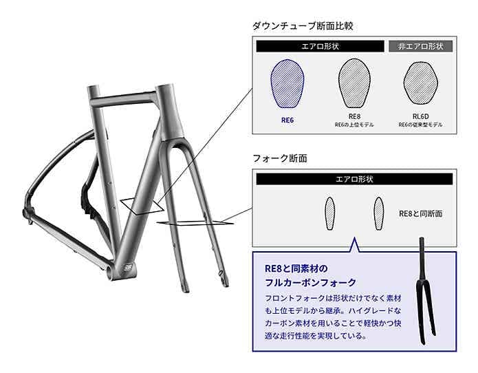 「RE6」には、上位モデル「RE8」と同様のカムテール型エアロ形状をダウンチューブとフォークに採用。レースモデルから受け継がれてきた空力性能をしっかり確保しています。