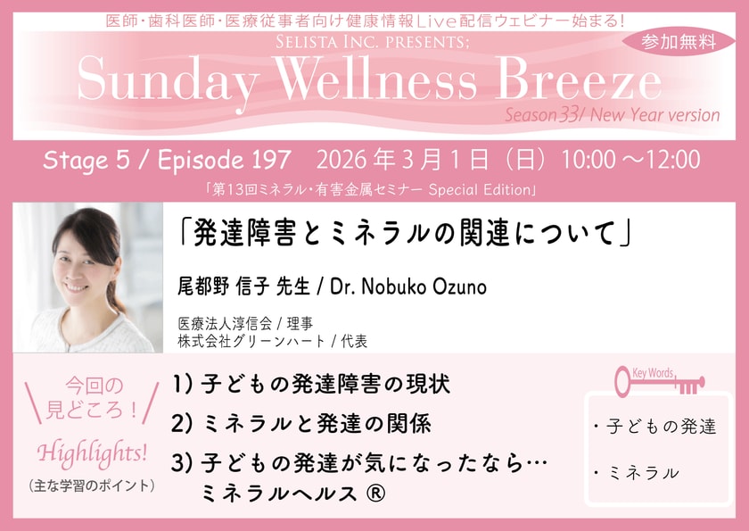 セリスタ株式会社が、2026年3月1日に医師や歯科医師などの医療従事者を対象とした無料のZoomオンラインセミナー「発達障害とミネラルの関連について」を開催します。