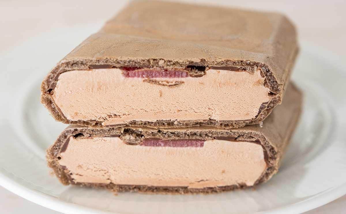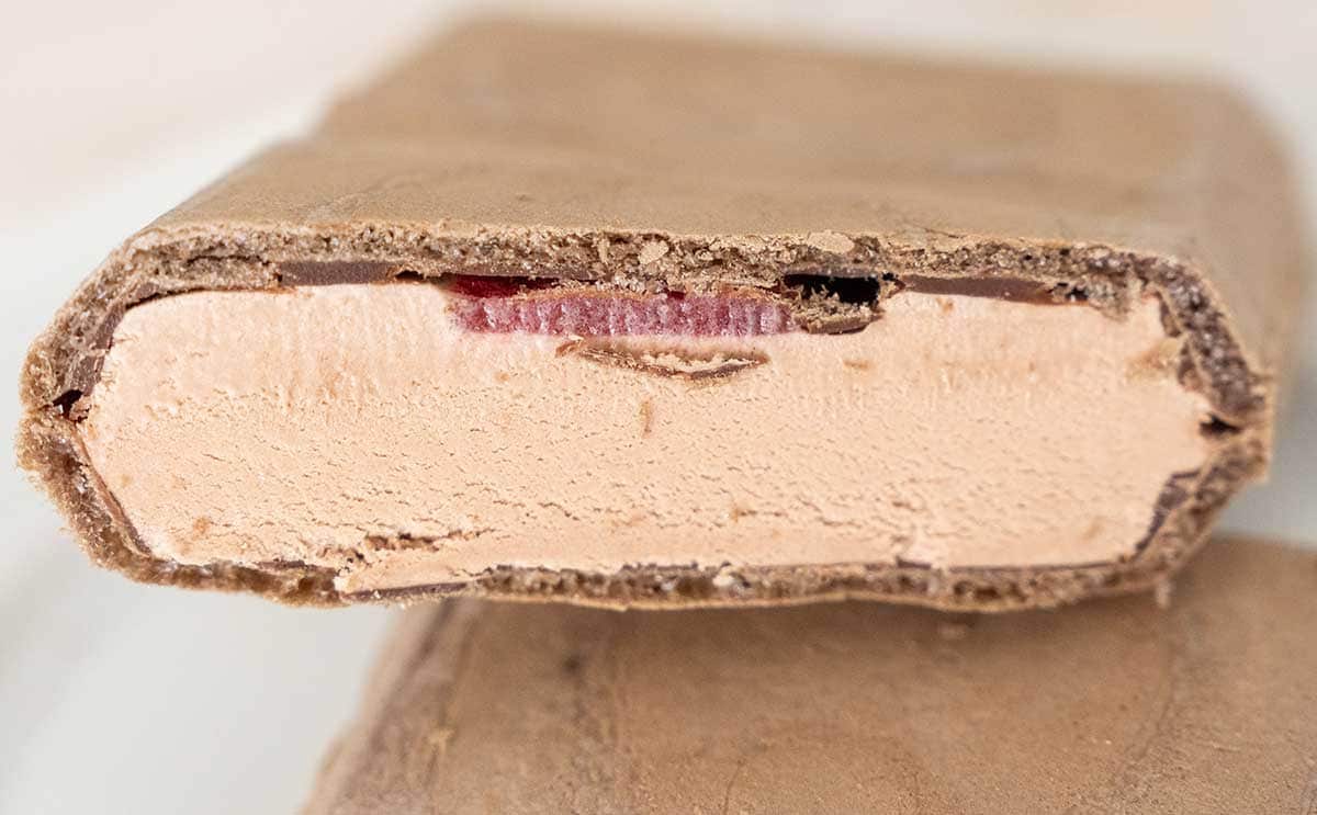 半分にカットし、中身をチェック。少しわかりづらいですが、モナカ皮とアイスの間にストロベリーソースが入っています。