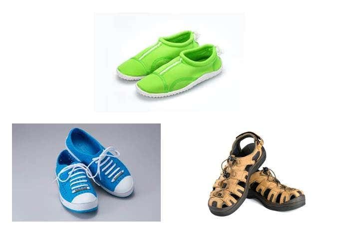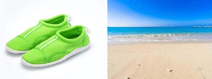 海水浴、シュノーケリング(マリンシューズを履いたままフィンを装着する場)、カヌー、ボートの水上の乗り物など。