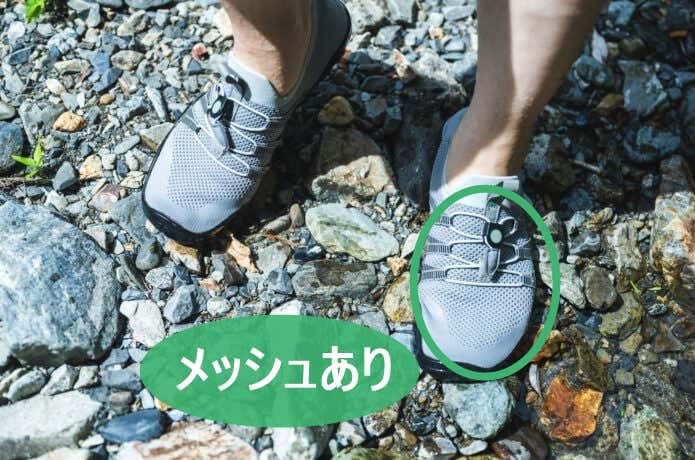 水抜けが良く、速乾性があるのは、「メッシュあり」のシューズ。ただし、メッシュの網目に、砂や小石などが詰まってしまい、お手入れがしにくい一面もあります。