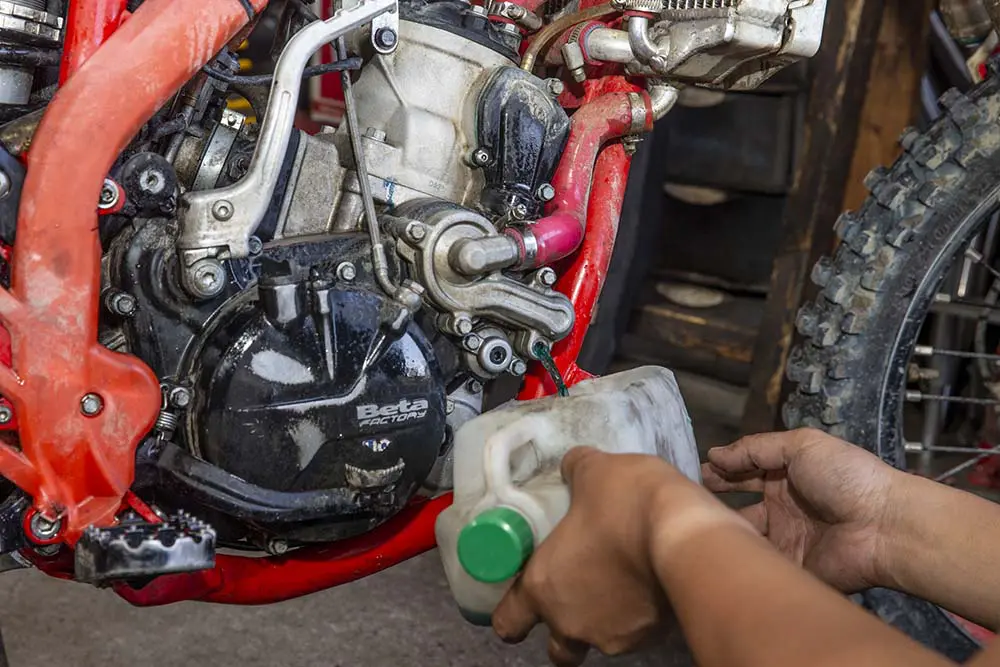 しっかりエンジンを組み終えてラジエターを戻したら、クーラントを入れましょう。エンジン内の通路を空にしたこともあって普段のクーラント交換よりもエアを噛みやすくなっています。クーラントが満タンになったあとにエンジンを始動することでウォーターポンプがまわり、水路のエア噛みを除去してくれます。そしてクーラントが目減りした分、継ぎ足せば、作業完了です!