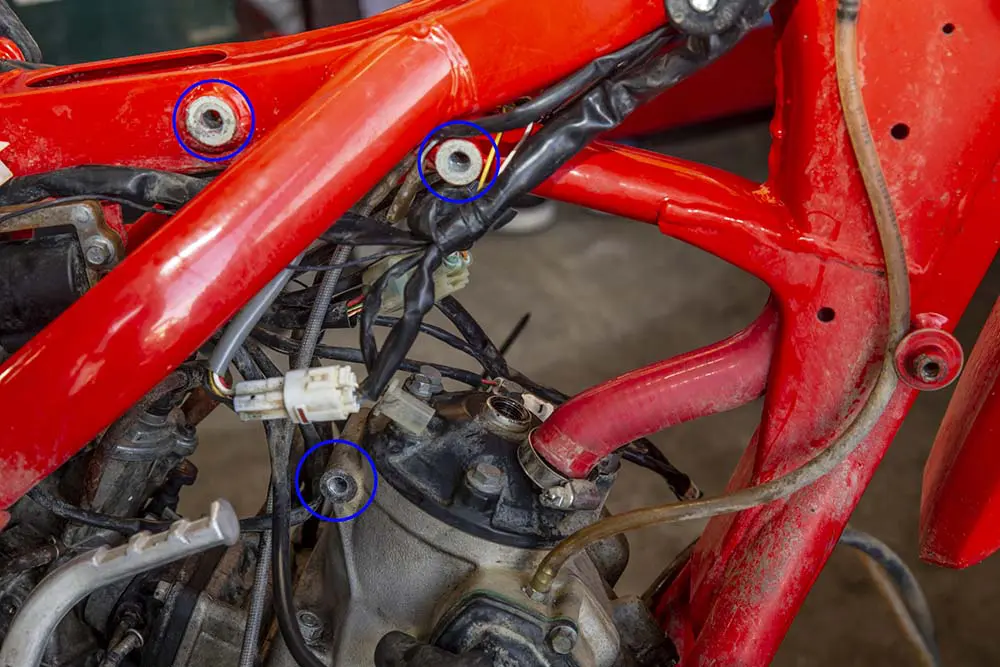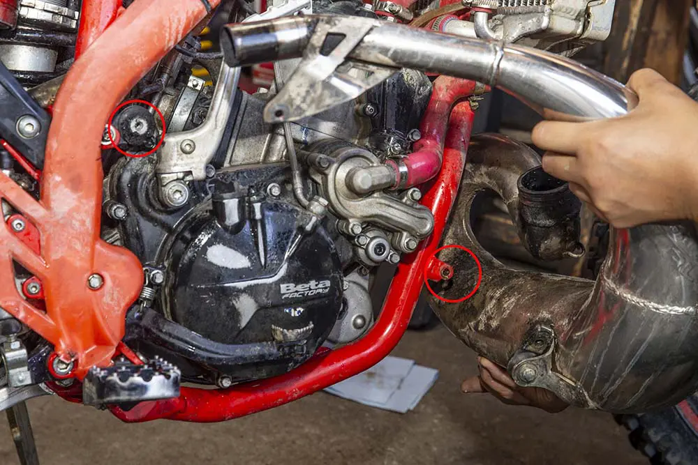 次にチャンバーを外します。こちらはフレームとチャンバーを留めているボルトを2本(写真の赤マル部)外して排気ポート部分のスプリングを外せば驚くほど簡単。