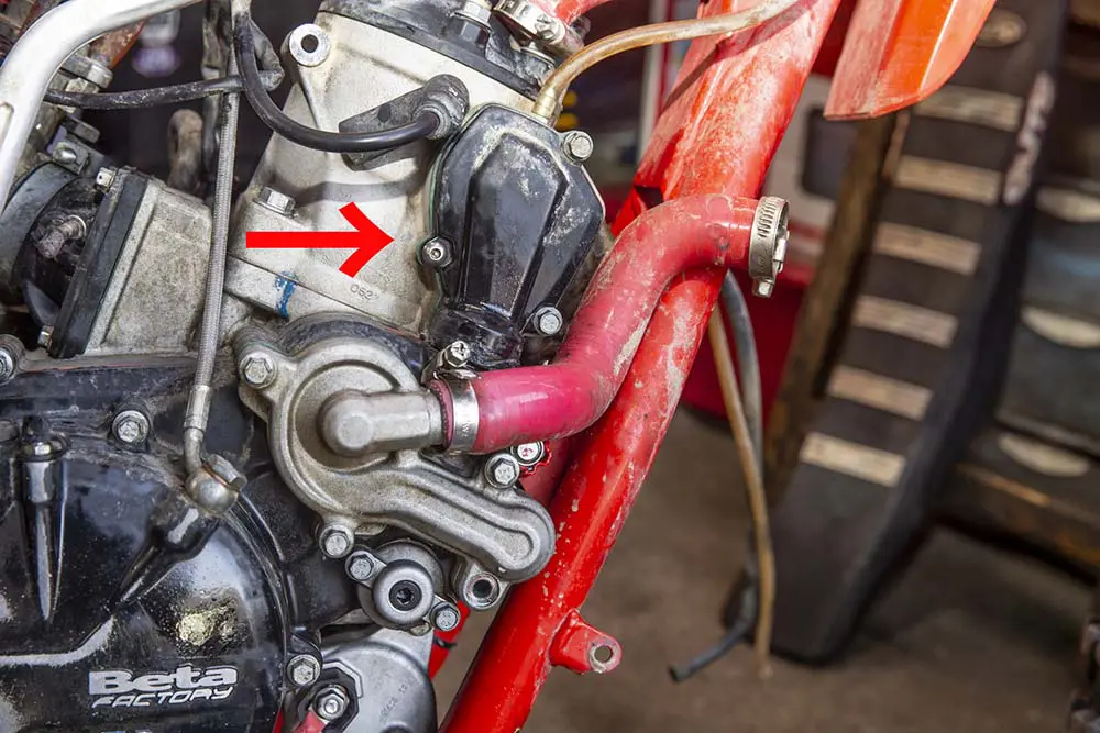 いよいよシリンダーを外していくのですが、その前に排気バルブの装置(写真赤矢印)を開けます。