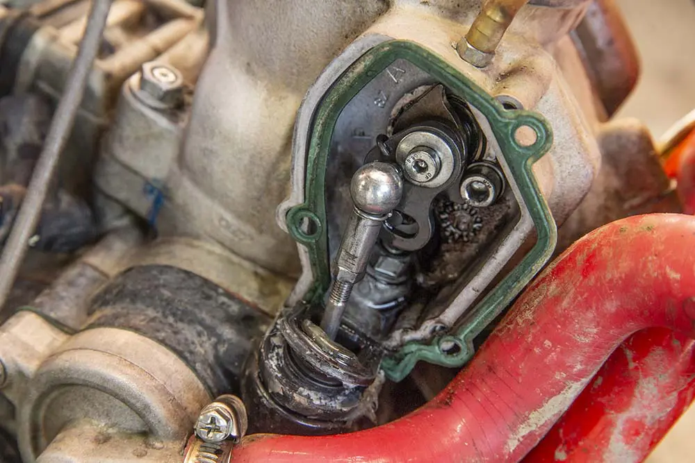 このように腰下からロッドが伸びています。このロッドが排気バルブのフラップに繋がっているため、これを外さなければシリンダーを外すことができません。