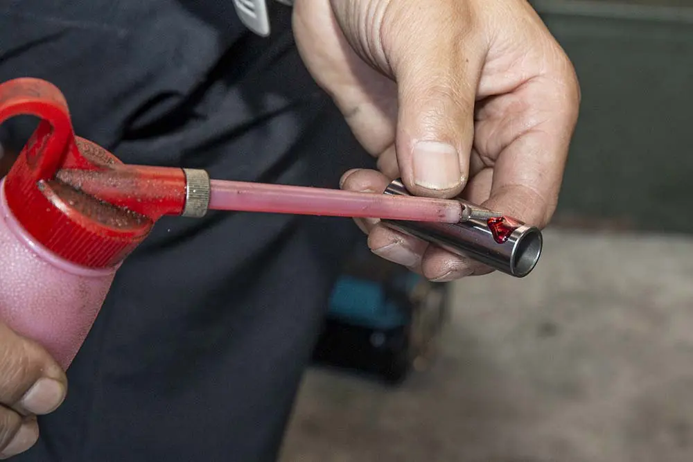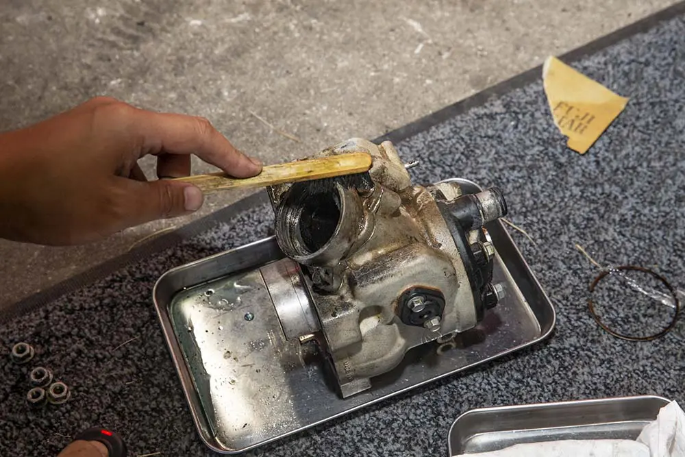 この時、シリンダーをパーツクリーナーなどの溶剤とナイロン系のブラシでゴシゴシ清掃してあげます。なかなか洗えないところなのでしっかり汚れを落としておきましょう。