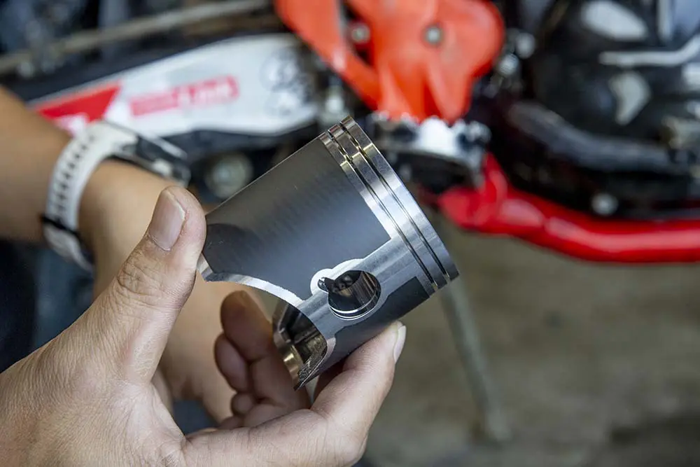 ちなみに新品はこちら。シリンダーと擦れる部分が黒くなっているのはモリブデンショットと呼ばれるコーティングで、潤滑性を上げて初期かじりを防止しています。BETA RR2T200のピストンは3万6600円。外車で、しかも少し特殊な排気量のため社外品も少なく、結構いいお値段ですが、例えばヤマハYZ125Xは7436円だったり。