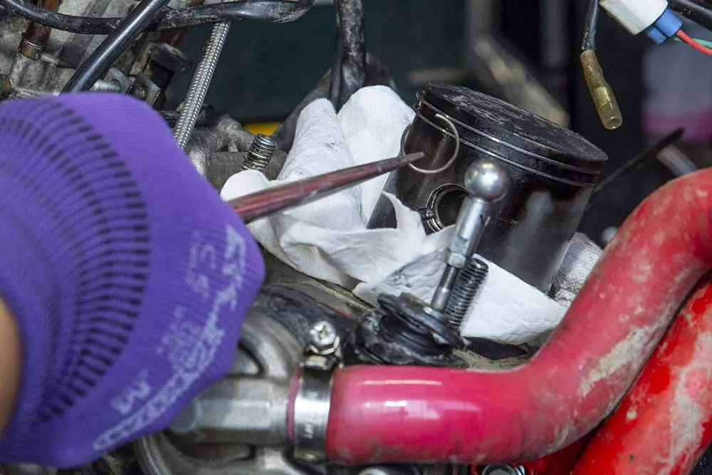 まずはピストンとコンロッドを接続しているピストンピンを外すため、プライヤーを使ってサークリップを抜きます。こちらは外した瞬間にどこかに飛んでいってしまうことが多いため、エンジン内部に落としてしまう最悪の事態を避けるためウェスなどを敷いて蓋をしておきましょう。サークリップはピストンピンの両側に入っていますが、片側だけ外せば反対側から指でピストンピンを押し出すことも可能です。ですが、車種やエンジン始動時間によっては硬くてなかなか抜けず、強引に押し出そうとしてコンロッドを曲げてしまう事態にも繋がります。