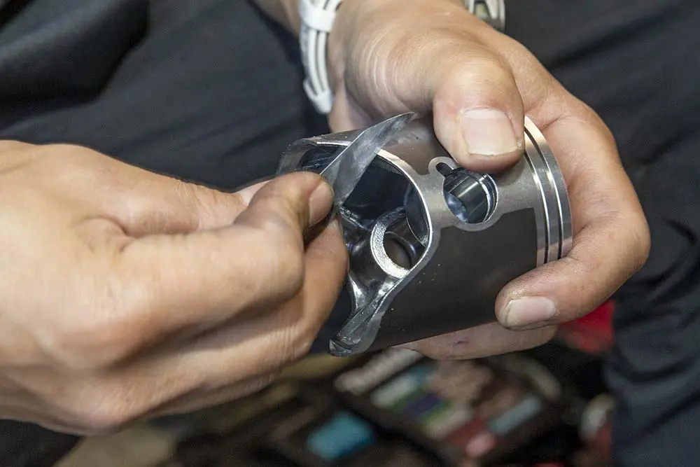ピストンにピストンリングを入れます。YZ125などのモトクロッサーはフリクションロスを嫌ってピストンリングが1本ですが、耐久性が求められるエンデュランサーや2ストトレールバイクは2本あります。