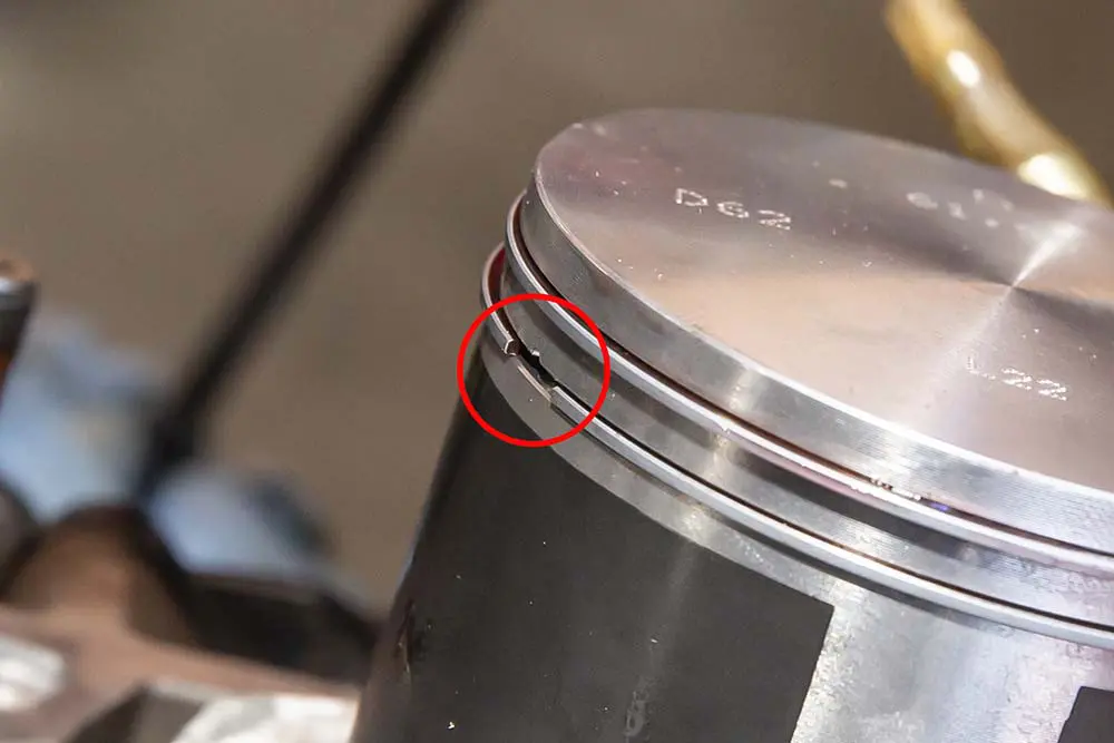 ピストンリングの切り掛けの位置をピストンのピンにしっかり合わせないとシリンダーを入れる際にピストンリングが折れてしまうことがあるので注意。